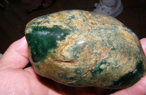有个比较简单的方法来辨别松花,首先我们看一块翡翠毛料的整体颜色,会发现翡翠毛料上有两种不同的颜色和基调,翡翠原石上两种颜色中会有块状不规则的东西就是“松”。由于颜色离子,在空间中的分布是比较稳定的,所以根据松花的颜色、数量的分布、形状的变化,可以推断出藤黄体内颜色的变化和分布。如果松花的颜色厚重艳丽,其价值就会很高;如果在翠绿的外壳上没有松花的表现,内部就很少会出现颜色;翡翠原石皮壳上松花的表现越多,内部的颜色就越多,但也有可能是松花只出现在表面,没有深入到里面的赌石里。